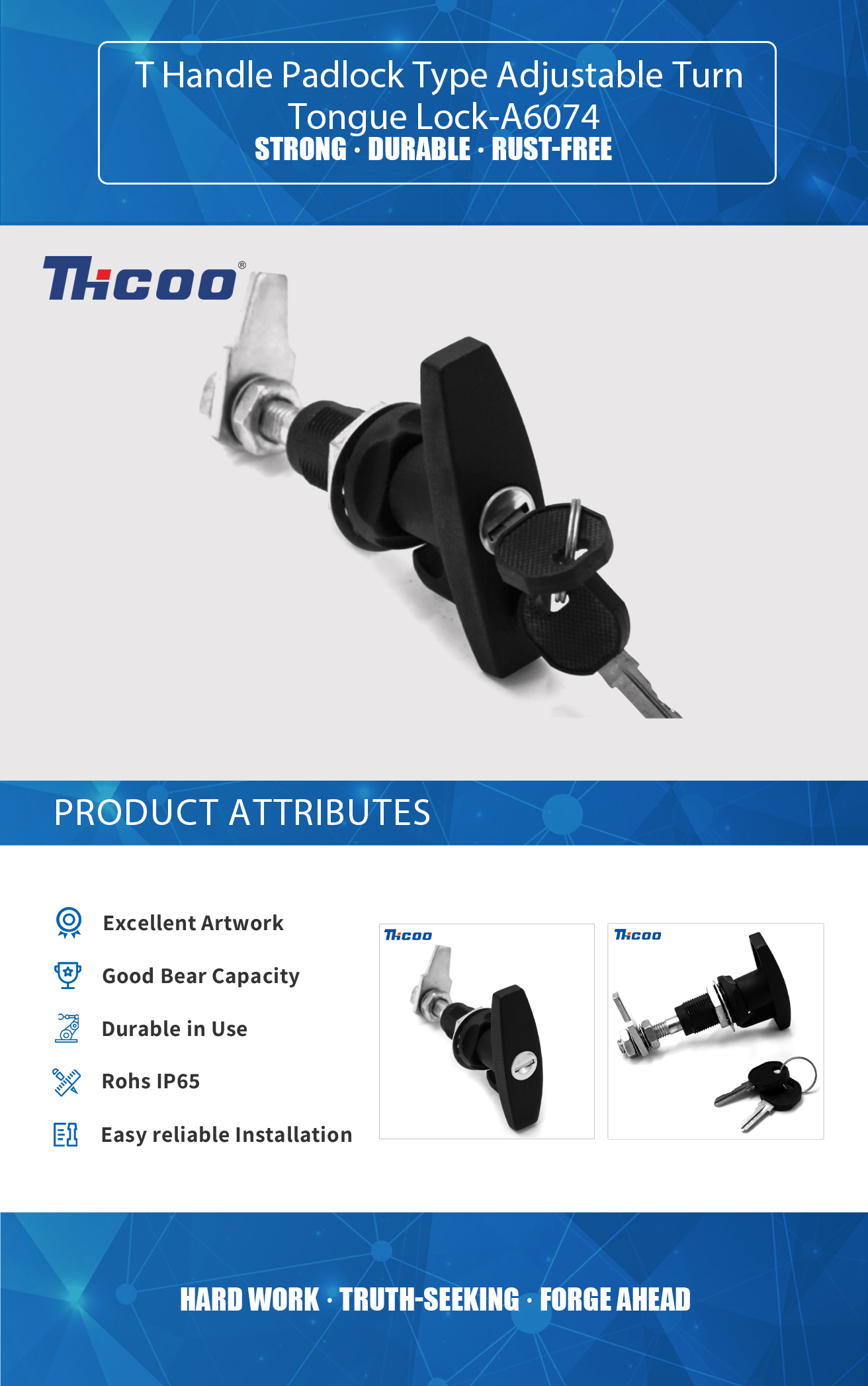 ما آزمایشگاه آزمایش خود و تجهیزات بازرسی پیشرفته و کاملی داریم که می تواند کیفیت محصولات را تضمین کند. قفل زبانه قابل تنظیم نوع قفل دسته T-A6074 دارای بدنه قفل T-bar استاندارد با صفحه چرخان برای قفل کردن قطعات درب. این نوع قفل از کلیدهای شماره برای باز و بسته شدن استفاده می کند که به شما امکان می دهد ترکیب های مختلفی را برای هر یک تنظیم کنید.