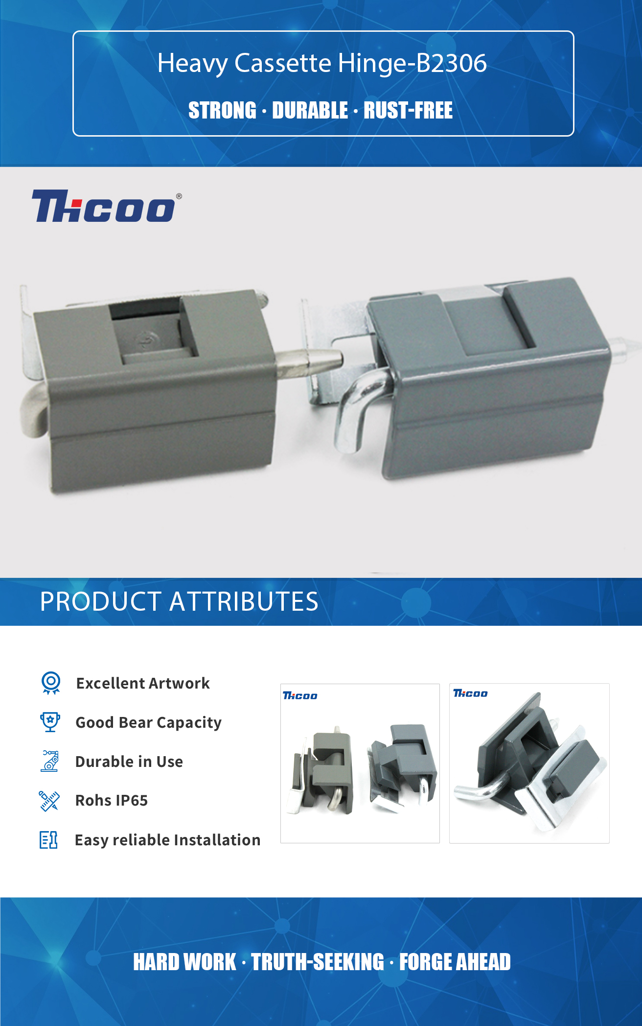 ما آزمایشگاه آزمایش و تجهیزات بازرسی پیشرفته و کامل خود را داریم که می‌تواند از کیفیت محصولات اطمینان حاصل کند. کاست سنگین لولا-B2306 برای پشتیبانی از یک پانل یا درب سنگین طراحی شده است. این لولاها اغلب در رنگ های مختلف مانند کرومی یا مشکی موجود هستند که به آنها اجازه می دهد با دکوراسیون اطراف ترکیب شوند.